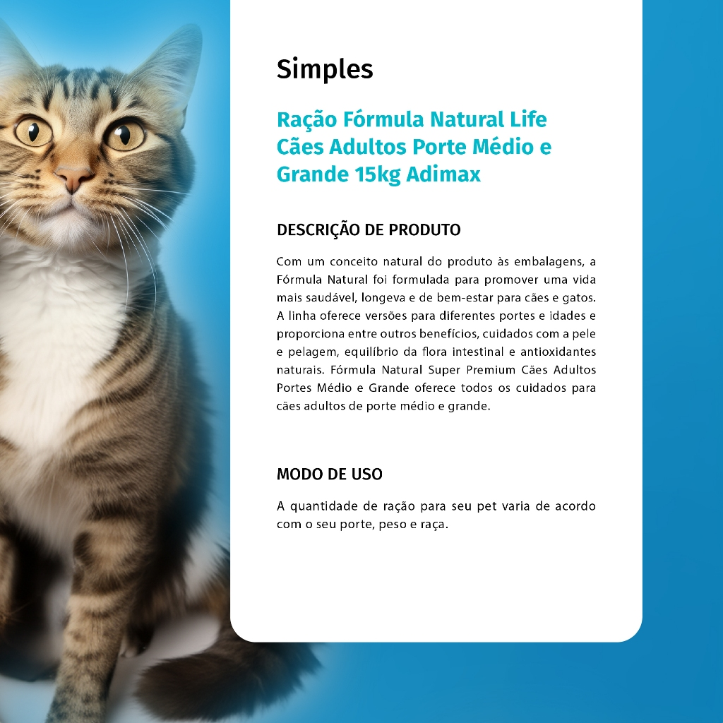 Garanta mais saúde, vitalidade e longevidade para o seu melhor amigo com a Fórmula Natural Life. Desenvolvida com ingredientes naturais e selecionados, essa ração Super Premium é ideal para cães adultos de médio e grande porte, oferecendo um cuidado completo e equilibrado.