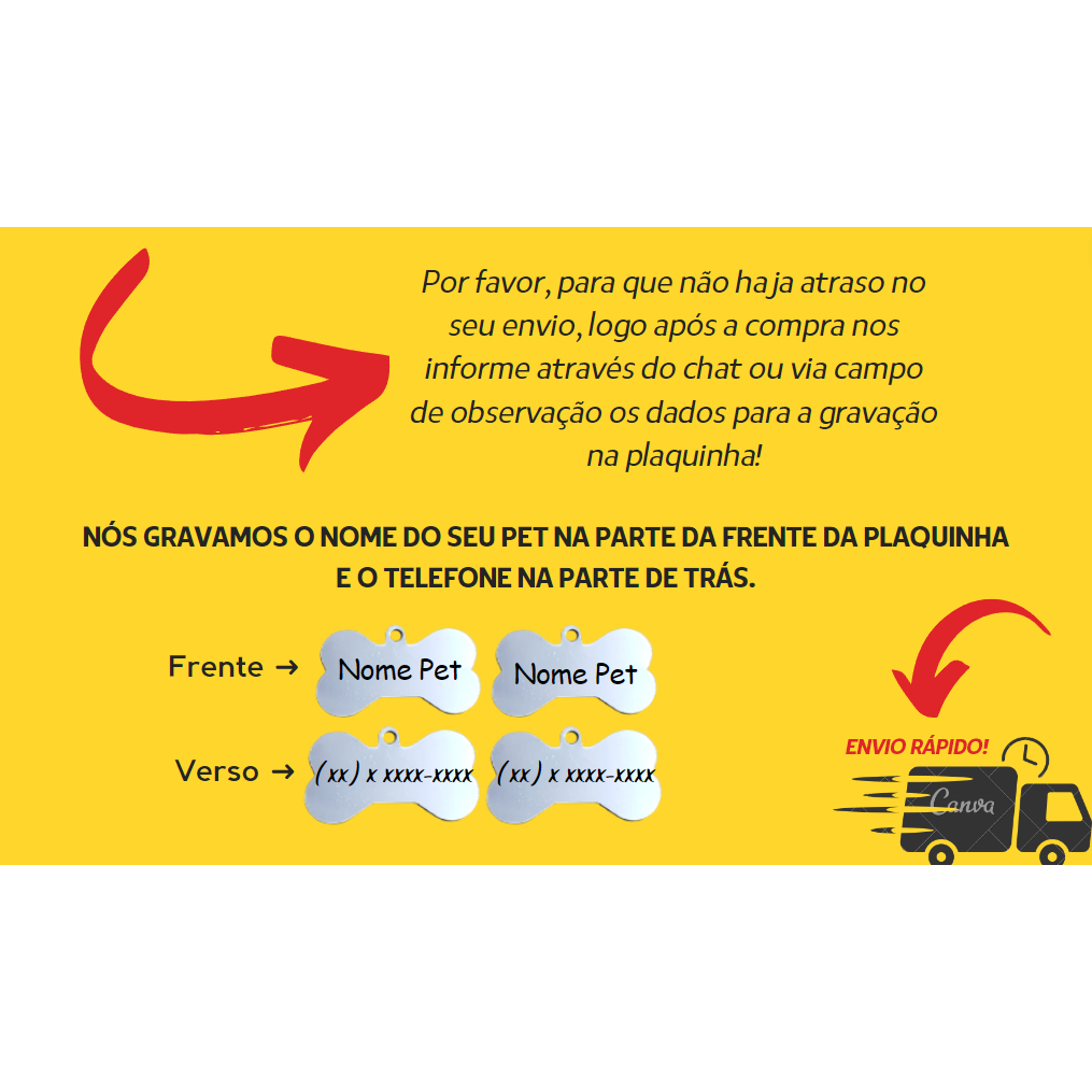 Não esqueça de informar, após a compra, o nome do seu pet e o número do telefone para gravação na plaquinha! Caso os dados não sejam enviados, a plaquinha será enviada em branco. A gravação é feita de forma permanente a laser, garantindo durabilidade e legibilidade.
